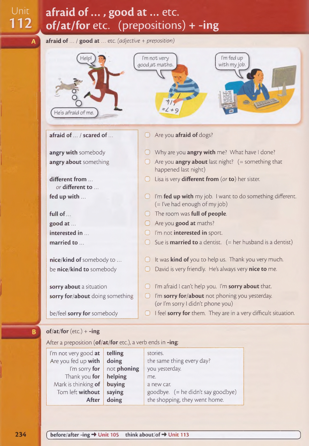 112 afraid o f…, good a t… etc of/at/for etc (prepositions) + -ing