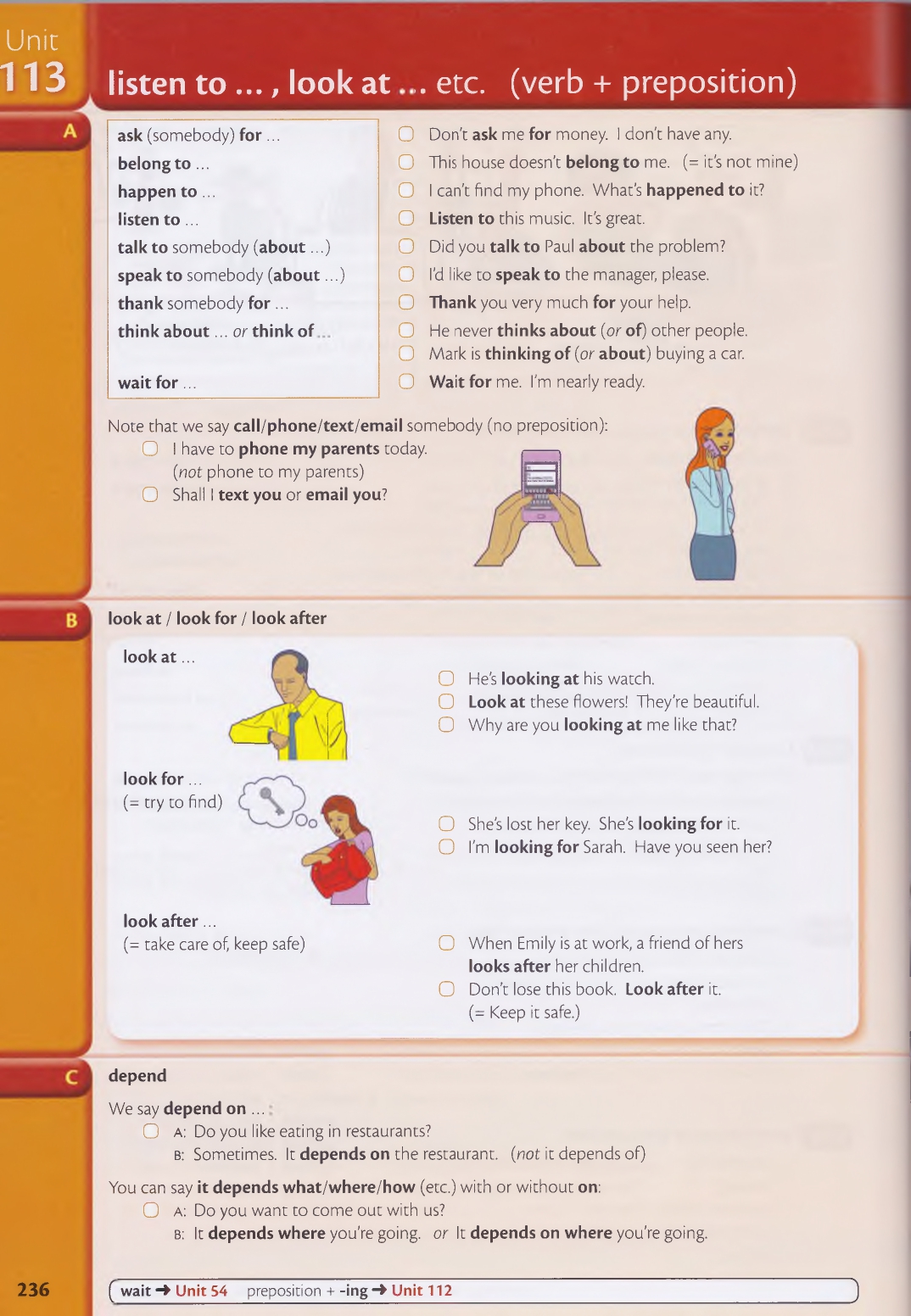 113 listen to . . ., look a t… etc (verb + preposition)